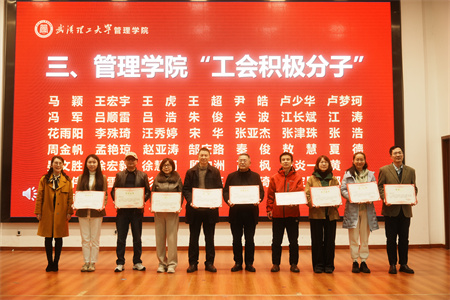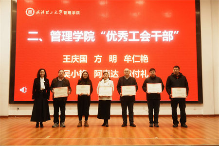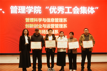 颁奖仪式上,陈晓芳院长为管理科学与信息管理系团队、创新创业与运营管理系团队、市场营销系团队、组织与人力资源系团队以及jdb电子游戏官方网站篮球队颁发jdb电子游戏官方网站“优秀工会集体奖”;为王庆国老师、方明老师、牟仁艳老师、吴小艳老师、袁付礼老师和阿克达老师颁发jdb电子游戏官方网站“优秀工会干部奖”。