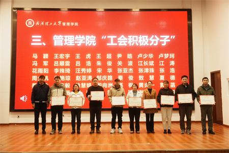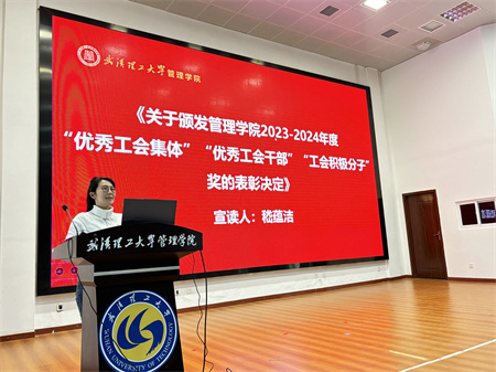 会上,嵇蕴洁副院长宣读了《关于颁发jdb电子游戏官方网站2023-2024年度“优秀工会集体”“优秀工会干部”“工会积极分子”奖的表彰决定》,表彰学院在过去一年中涌现出的优秀集体和个人,激励和动员广大教职员工创优争先,全力推动高质量高水平学院建设取得新成效。