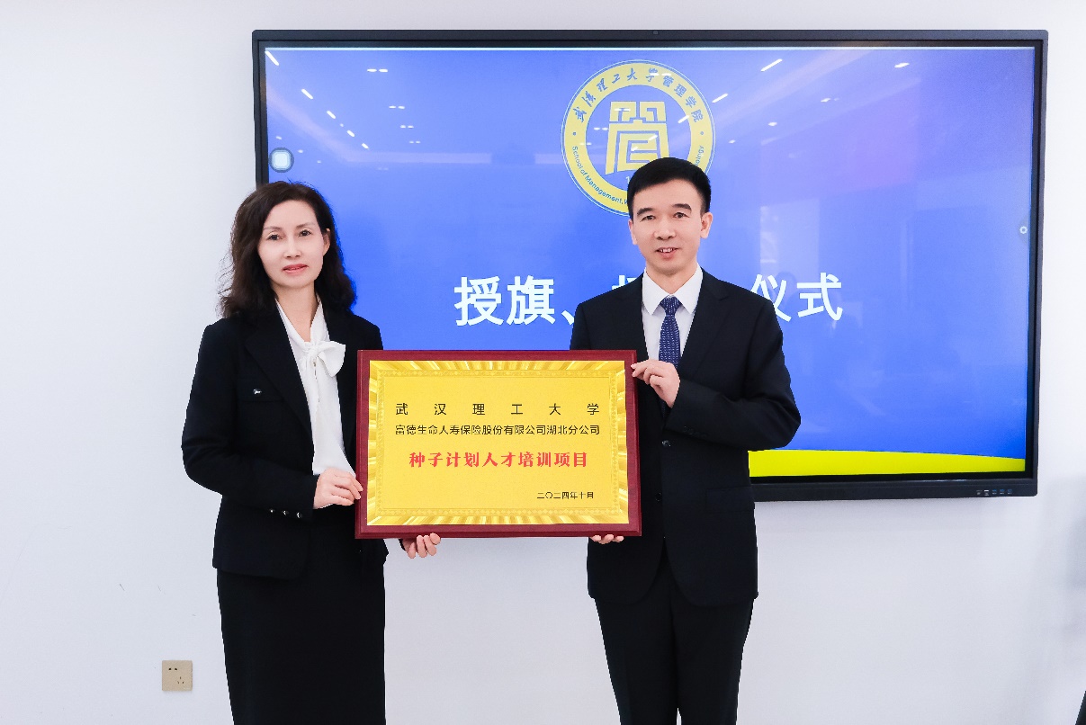 随后,桂衍胜总经理代表公司向学校授予人才培训基地牌匾,陈晓芳院长代表学校向培训学员代表授予班旗。