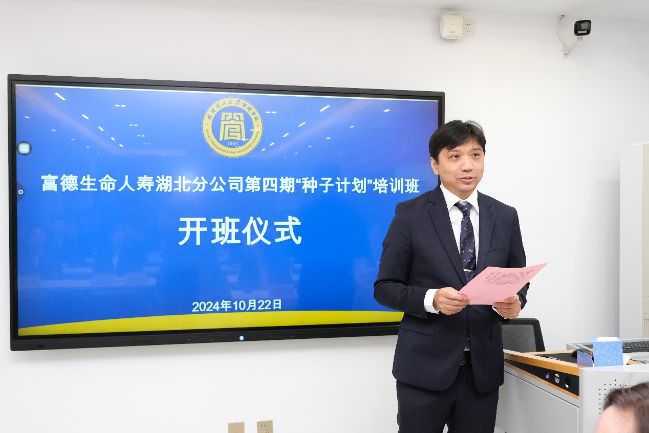 22日上午,培训班举行开班仪式。富德生命人寿保险股份有限公司湖北分公司党委书记、总经理桂衍胜先生,jdb电子游戏官方网站院长陈晓芳教授、副院长张光磊教授出席开班仪式。