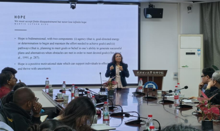 讲座伊始,Thilakshi教授以“积极心理资本为何重要:提升员工福祉与组织韧性的路径”为题,指出积极心理资本作为个体核心心理资源,对员工态度、行为及绩效至关重要。她拆解自我效能、乐观、韧性与希望四大要素,阐释其在应对不确定性、提升工作满意度与组织韧性中的作用,强调人际与同伴支持可推动心理资本正向发展,为组织管理提供实用路径。