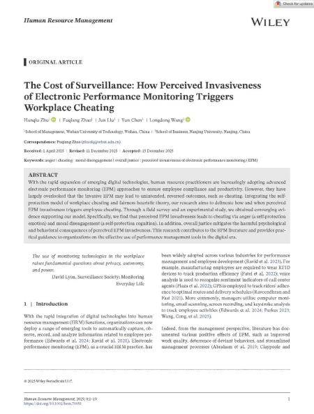近日,jdb电子游戏组织与人力资源管理系赵富强教授战略人力资源管理团队博士生祝含秋以第一作者身份在人力资源管理领域顶级学术期刊Human Resource Management上在线发表论文“The Cost of Surveillance: How Perceived Invasiveness of Electronic Performance Monitoring Triggers Workplace Cheating”。该论文由赵富强教授担任通讯作者。