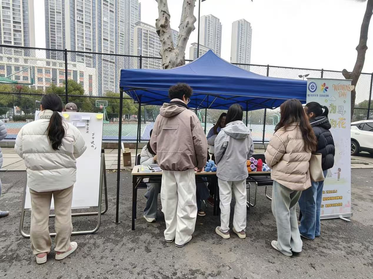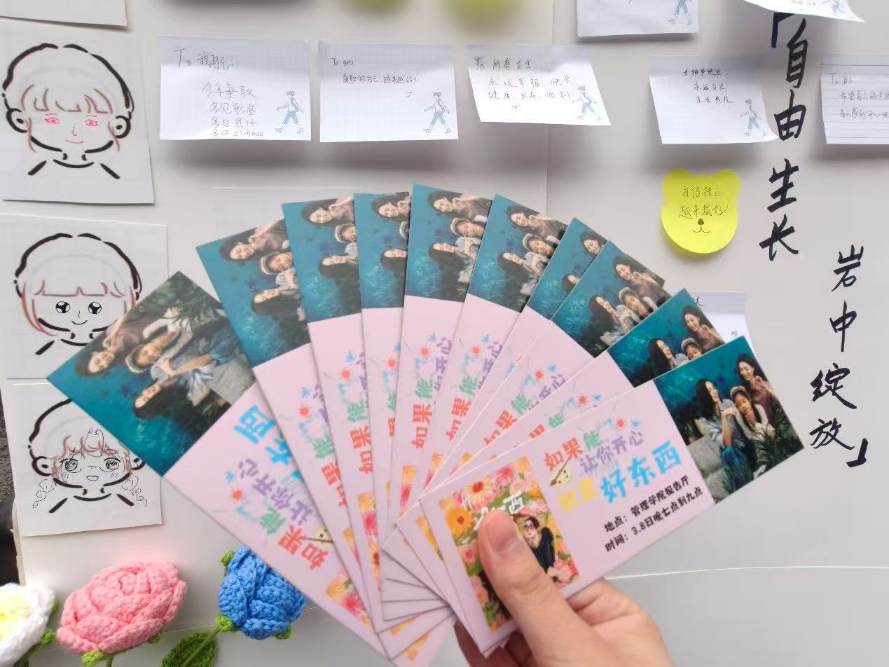 活动伊始,创意互动于智苑食堂门口正式拉开帷幕。“自由女神画”区域吸引了众多同学执笔参与,大家或专注勾勒身边优秀的女性形象,或自由创作象征女性力量的图案,用色彩表达对“她力量”的真诚赞美。相邻的“心愿墙”前也聚集了大量同学,大家认真书写祝福与期许,一张张承载真挚情感的便签很快贴满展板,成为校园中一道温暖的风景。现场工作人员有序分发针织鲜花与纪念观影券,以细致服务保障活动顺畅进行,展现“贴近同学、务实服务”的工作作风。