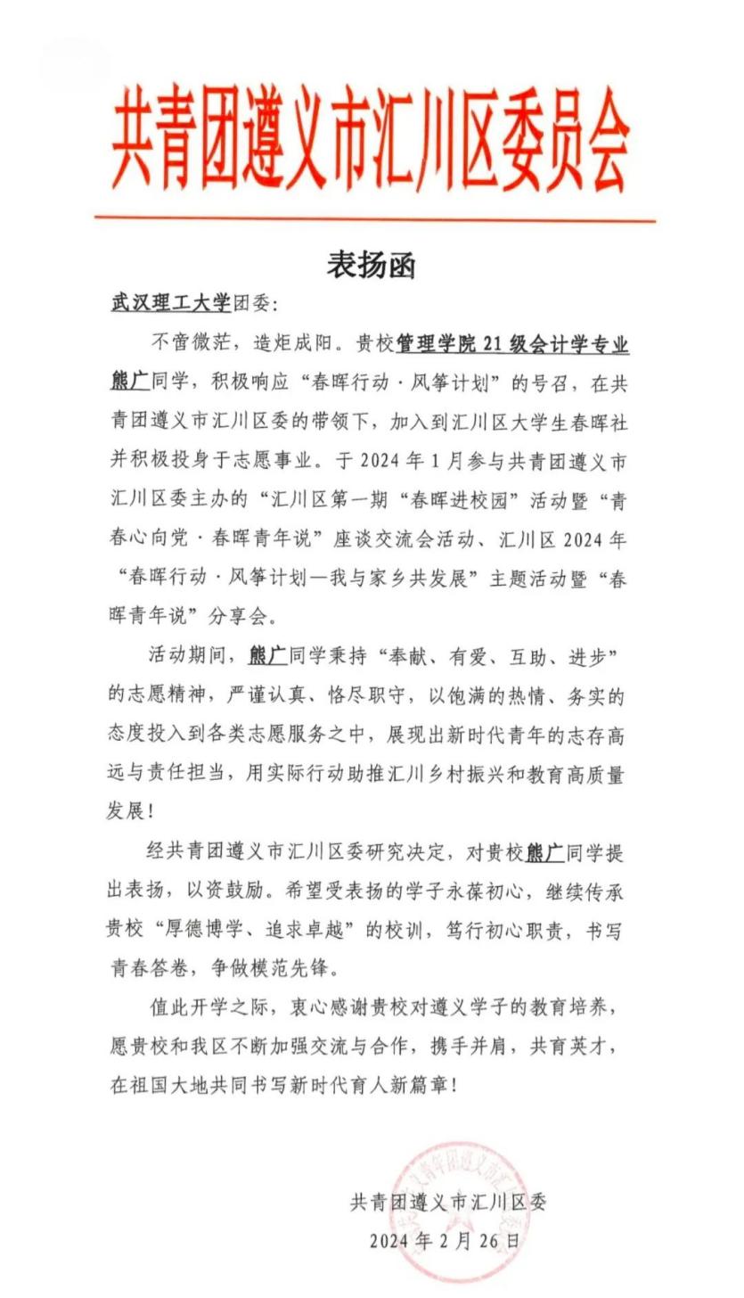 近日,学校团委收到了一封来自共青团遵义市汇川区委的感谢信对我校jdb电子游戏官方网站21级会计专业的熊广同学参加遵义市汇川区“春晖行动”志愿服务投身贵州省“春晖行动·风筝计划”表示衷心感谢。