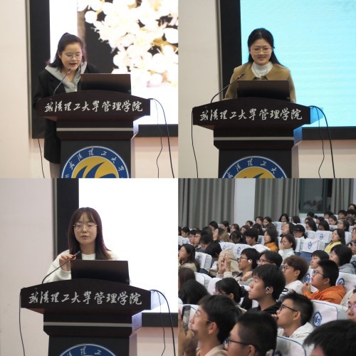 信管专业的冯启霞学姐对专业的定位进行了介绍,还鼓励同学们多多参与志愿活动、科研竞赛等实践活动。营销专业的胡金阳学长对专业进行了解读以及鼓励新生们去感受自我,寻找真我,不负青春韶华。工商管理专业的闫旦学姐分享了个人心得,认为在大学里综合发展是极为重要的,鼓励新生们在学好专业课的同时,积极参与校园活动、担任学生工作和进行社会实践。